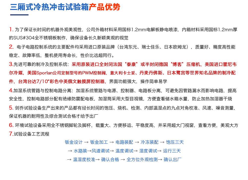 產品型號:JQTS3-408 品牌:劍 喬 用途:三箱式冷熱沖擊試驗箱又名溫度沖擊試驗或高低溫沖擊試驗是用于考核產品對周圍環境溫度急劇變化的適應性,裝備設計定型的鑒定試驗和批產階段的例行試驗中不可缺少的試驗,在有咨詢熱線:13829135130