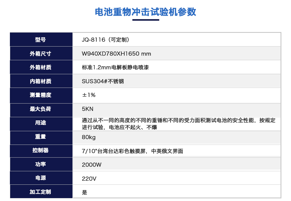 產(chǎn)品型號:JQ-8116(定制款) 品牌:劍 喬 用途:電池重物沖擊試驗機是模擬通過從不一同的高度的不同的重錘和不同的受力面積測試電池的安全性能,按規(guī)定進行試驗,電池應(yīng)不起火、不爆炸。也是各電池廠家及研究所必不可少的檢咨詢熱線:13829135130