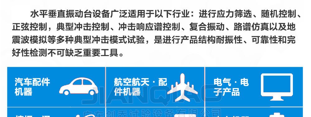 用途:該水平垂直振動臺可模擬再現正弦、隨機、諧振搜尋與駐留、典型沖擊和道路仿真等模式,符合:(MIL-STD,DIN,ISO,ASTM,IEC,ISTA,GB,GJB,JIS,BS等國家及國際測試標準)