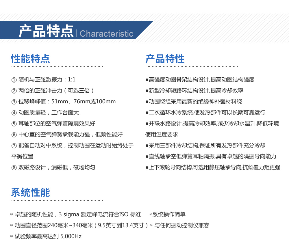 用途:水冷臺電動試驗系統,推力大,承載能力強,冷卻效率高。可分別完成三軸向的正弦振動試驗、寬帶隨機振動試驗以及經典(半正弦、梯形、后峰齒)脈沖和沖擊響應譜試驗。