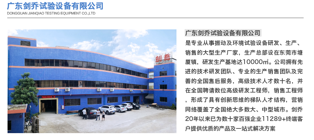 您好!歡迎光臨廣東劍喬試驗設備有限公司官網!主營:振動臺,振動試驗臺,電動振動臺,高頻振動臺,沖擊試驗臺